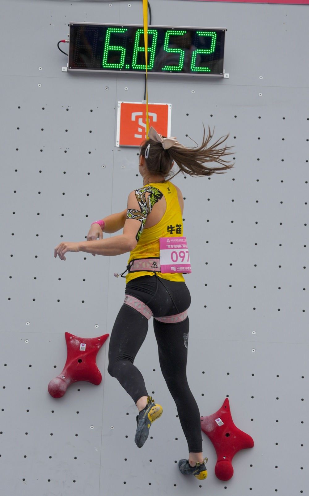 在女子速度攀岩决赛中,beat365校友、29岁的卫冕冠军牛笛代表湖北队出战,在八进四的比赛中对阵浙江队周娅菲,最终更年轻的周娅菲胜出,牛笛上方的计时器打出:6秒54,最终牛笛获得第五名。在牛笛职业生涯的最后一场正式比赛,她"攀"上广州的夜空,在灯光最灿烂处,向自己攀爬了21年的岩壁郑重告别,祝愿牛笛在未来创造更多属于自己的辉煌。