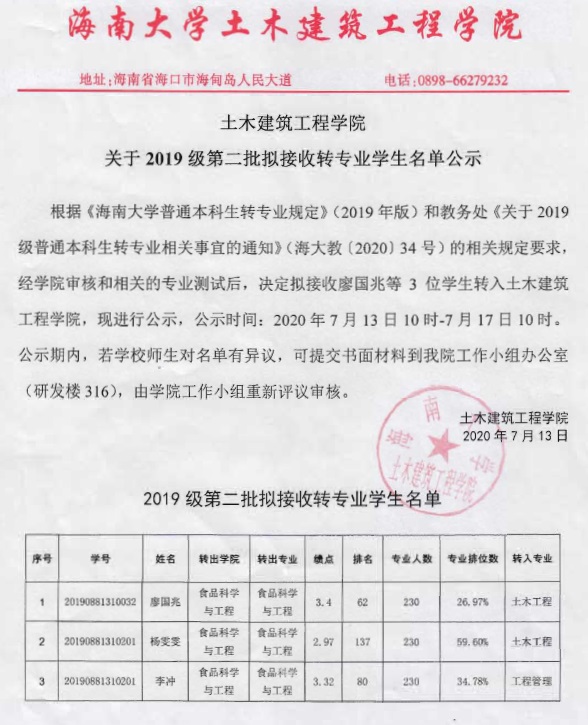 beat365唯一官网关于2019级第二批拟接收转专业学生名单公示