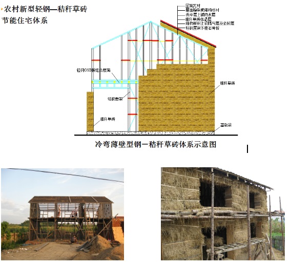 以抗震性能好的冷弯薄壁型钢结构和木结构为承重体系,并将来源广泛、价格低廉和具有良好隔热性能的秸秆草砖作围护墙体建造农村二层住宅,必将提高农村居民的居住质量,减轻生活负担,降低对环境的压力,建设宜居及生态可持续发展的现代化新农村,实现真正的“美丽乡村”中国梦。冷弯薄壁型钢草砖节能住宅体系的承重和围护结构及饰面材料均为绿色、环保建材,不仅可以消耗过剩的钢材产能,还可以最大限度利用农业秸秆,避免焚烧、保护环境。