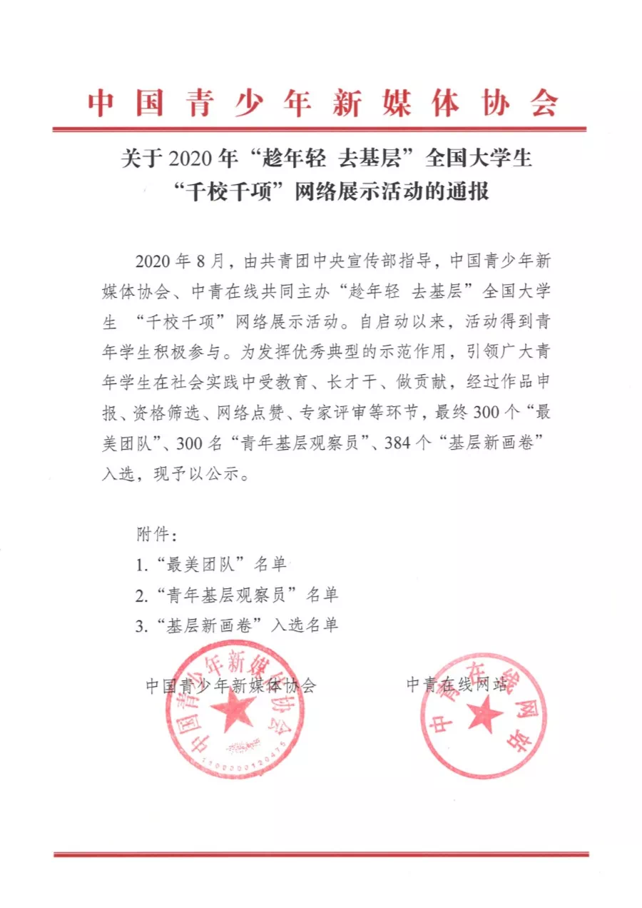 2020年8月,由共青团中央宣传部指导,中国青少年新媒体协会、中青在线共同主办了“趁年轻 去基层”全国大学生“千校千项”网络展示活动。自启动以来活动得到青年学生的积极参与。为发挥典型的示范作用,引领广大青年学生在社会实践中受教育、长才干、做贡献,经过作品申报、资格筛查、网络点赞、专家评审等环节,最终300个“最美团队”、300名“青年基层观察员”、384个“基层新画卷”入选。
