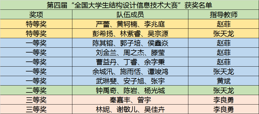 2022年5月10日,第四届“全国大学生结构设计信息技术大赛”获奖名单公布,由beat365唯一官网BIM协会选拔的10支队伍参赛并全部获奖,获奖率为100%!其中荣获特等奖2支队伍,一等奖5支队伍,二等奖1支队伍,三等奖2支队伍。可喜可贺的是,由赵菲老师指导的“beat365唯一官网(严蕾、黄轲楠、李兆庭)”团队以95.25的高分获得全国特等奖第一名!除此之外,赵菲老师和张天龙老师获优秀指导教师奖。
