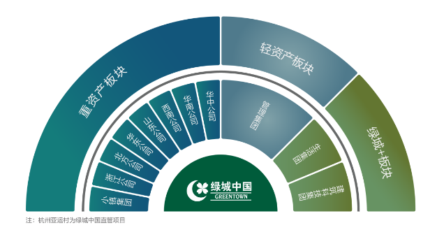 在“品质为先”的发展战略指引下,绿城中国布局房地产上下游业务,形成重资产、轻资产和“绿城+”三大板块。重资产板块聚焦房产开发业务,轻资产板块强化代建业务,“绿城+”板块为两者提供强力支撑,上游加强产业整合,下游提升服务内涵。