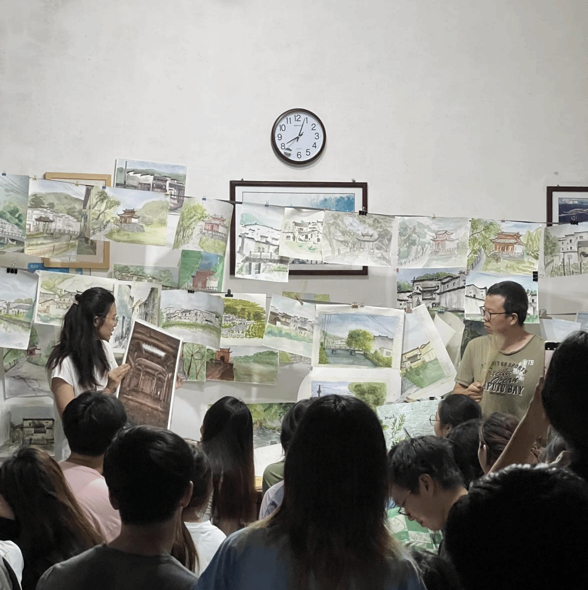 建筑艺术表现基础实习旨在让同学们了解徽派建筑的功能布局、结构和细部特点,通过对建筑分析抓形、重点提取、色彩表达的训练,综合提升学生对建筑整体的认知和表达能力。实习过程中,白天同学们进行建筑写生,傍晚由老师们组织作品联展与作业讲评。