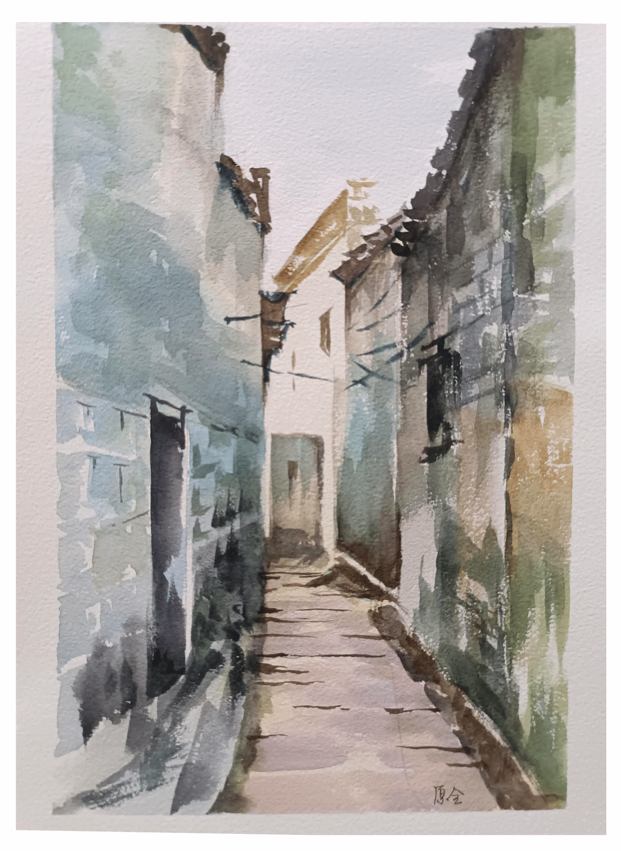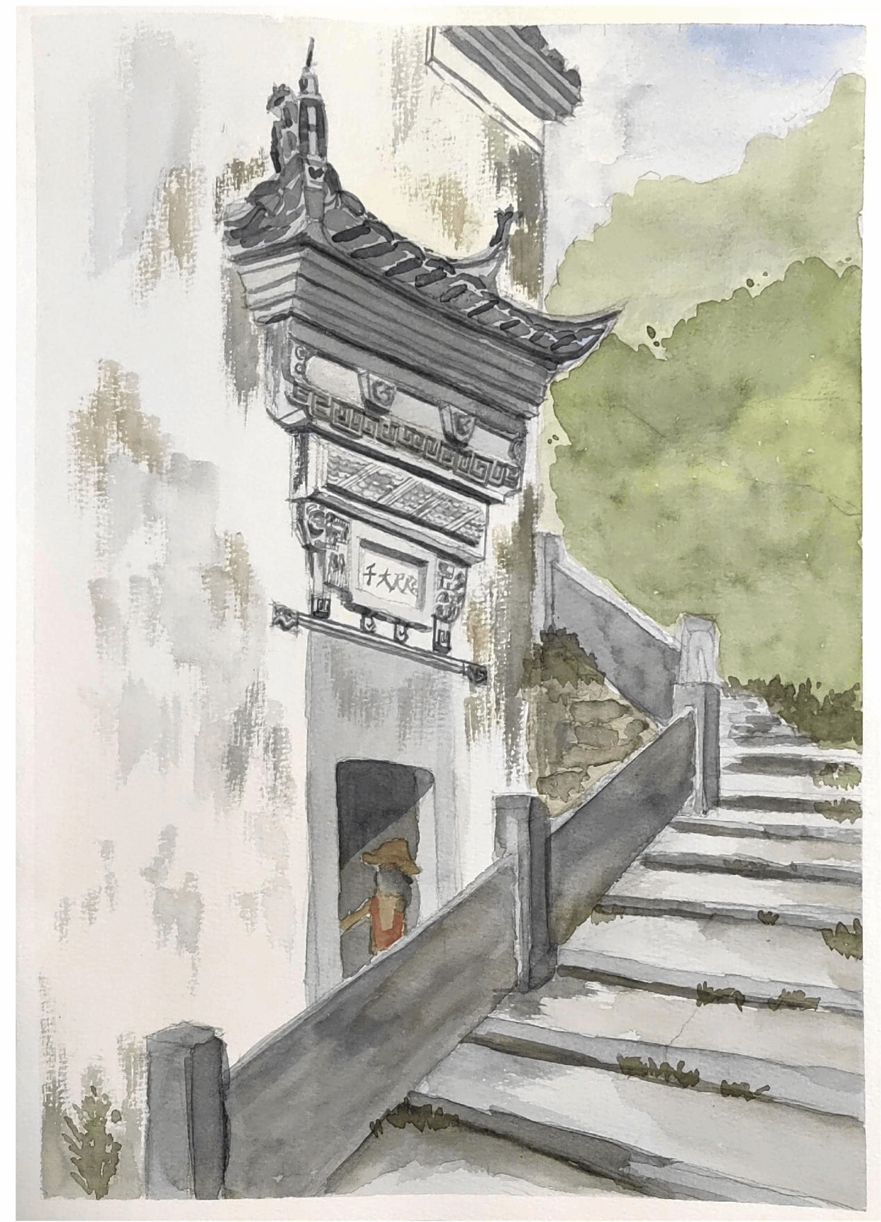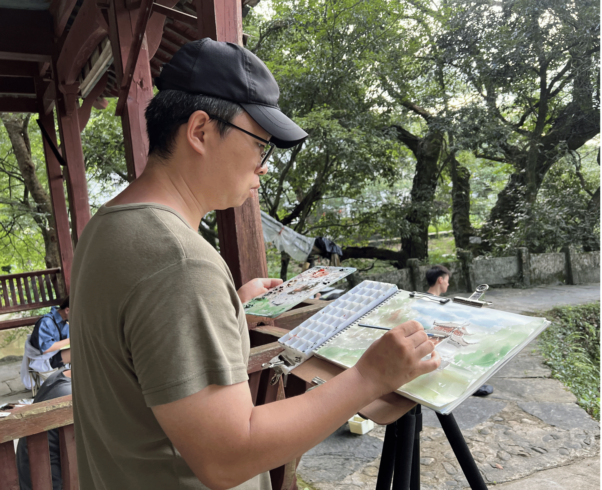 蒋伊琳老师在进士第前示范了记录建筑内部结构的速写方法和对建筑主体及配景主次区分的表达技法,并在傍晚评图时对建筑水彩表达的几个层次进行讲解。