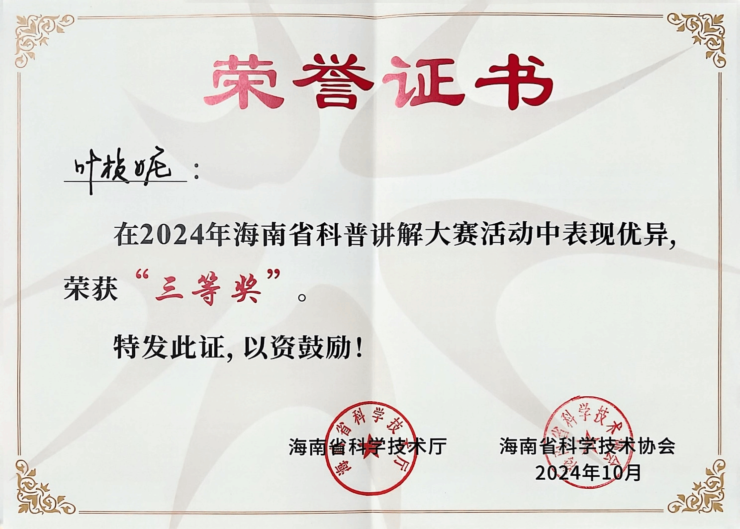 在刚刚落幕的2024年海南省科普讲解大赛中,beat365唯一官网土木与建筑工程学院叶桢妮副教授以出色的表现获得三等奖,为我校争得了荣誉。本次大赛以“弘扬科学家精神 激发全社会创新活力”为主题,吸引了全省各行各业的143名选手参与。海南省科普讲解大赛是全省科普工作者沟通交流、展示风采的重要平台,也是海南科普活动的一张亮丽名片。自2015年以来,大赛已成功举办十届,参与人数持续上升,活动形式不断创新,活动层次不断提高,已成为目前全省范围最大、水平最高、代表性最强的科普讲解竞赛。