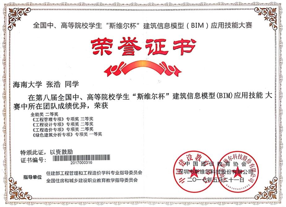 beat365唯一官网由曹新颖、刘金灿两位老师全程专业指导,由曹新颖老师带队,张浩、李可青、康露瑶、王琴、蔡剑洪五名同学组成的“A408”代表队前往浙江理工大学参赛,在比赛中团结协作、相互配合,最终获得该项赛事历史性的突破,取得辉煌成绩,一举拿下比赛全能二等奖、绿色建筑专项一等奖、工程造价专项二等奖、工程设计专项二等奖、工程管理专项三等奖,并由于出色的组织、完美的团队配合,获得“优秀团队组织奖”。
