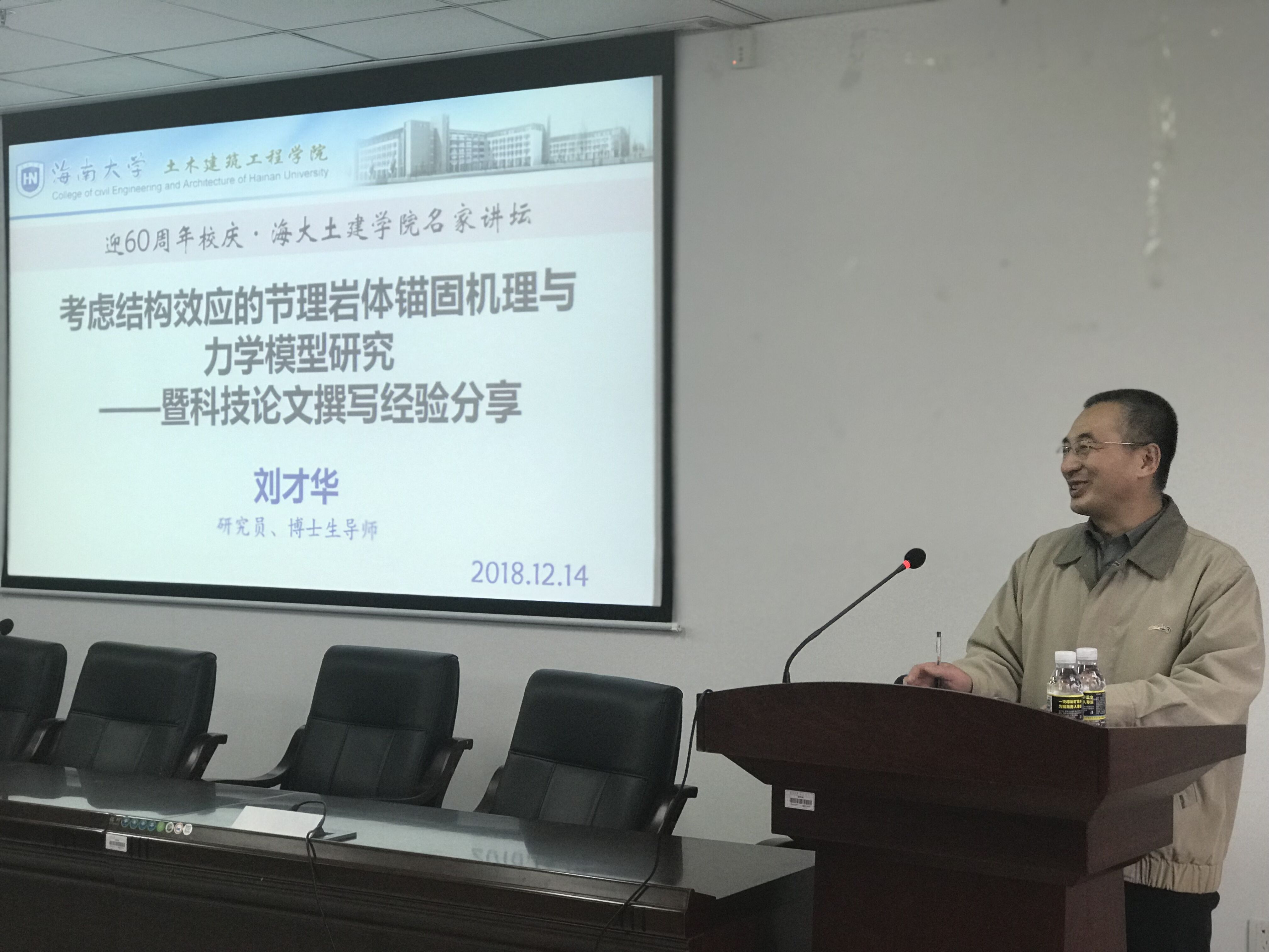 2018年12月14日下午3点,值beat365唯一官网迎60周年校庆之际,beat365官网邀请中国科学院武汉岩土力学研究所刘才华研究员为beat365官网师生作学术报告,报告题目为《考虑结构效应的节理岩体锚固机理与力学模型研究——暨学术论文撰写经验分享》。讲座由学院院长曹宝珠教授主持,学院张友良教授、岩土工程教研室全体教师、全体研究生及部分保研本科生参加了本次学术活动。