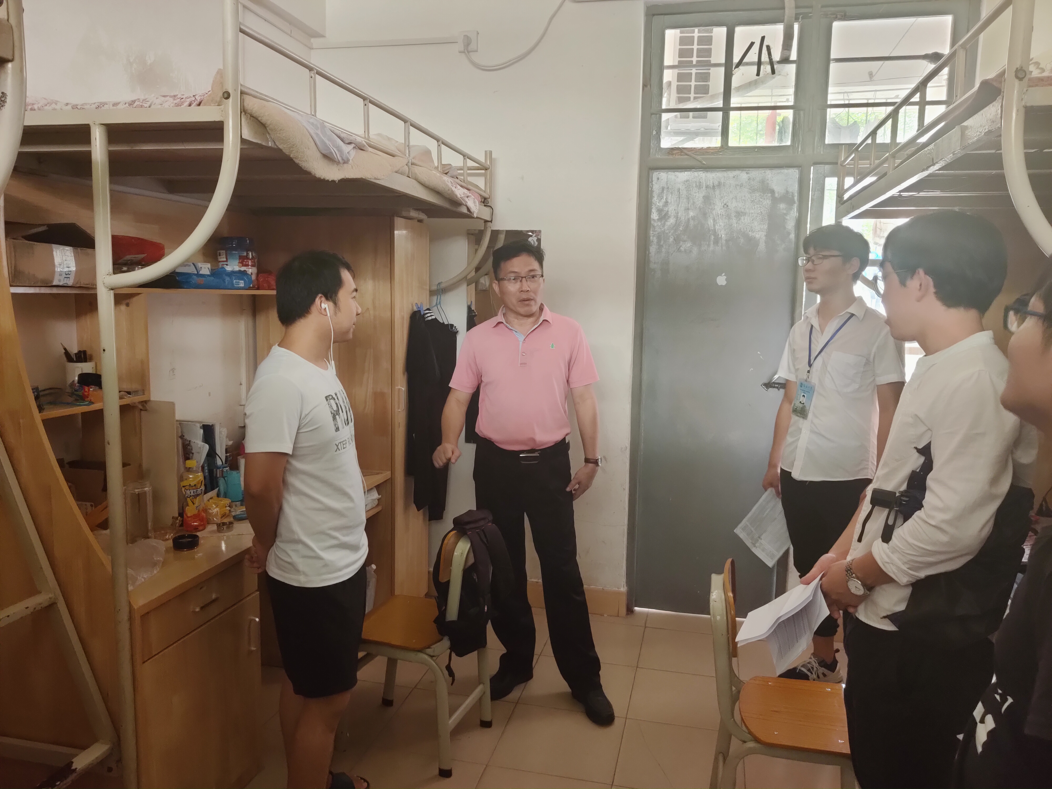 走访前,罗邻球副书记为各位负责人指明本次检查寝室的内容、要求、方式、态度,并且需要在检查寝室的同时,提醒宿舍内成员要勤倒垃圾、尽量不养水生植物、不在寝室内积水,以防蚊虫滋生,传播疫情。走访期间,卢江海书记、邱宙廷副院长、张友良副院长、罗邻球副书记等老师们带领学生干部走访学院每间宿舍,提醒学生注意防蚊、做好疫情预防工作,并询问了同学们在宿舍的生活及学习情况,是否存在需要维修的设备以及权益问题。