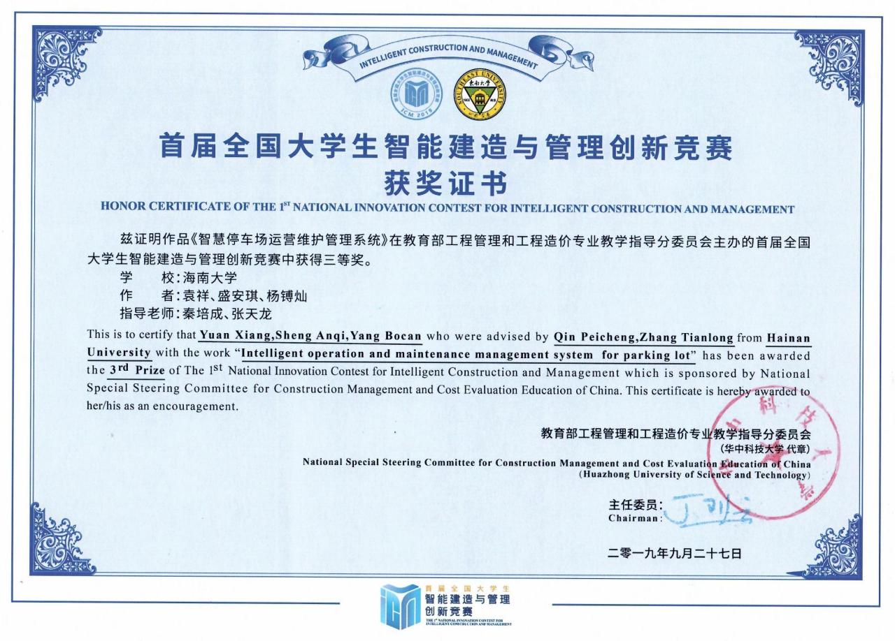 首届全国大学生智能建造与管理创新竞赛于2019年9月14日至9月15日在东南大学举办,beat365官网和计算机与网络空间安全学院跨学科跨专业联合组队,经过提交作品、现场答辩和专家评审等环节代表队荣获三等奖。参赛学生队员分别为2016级工程管理专业袁祥、盛安琪同学及2016级计算机科学与技术专业杨镈灿同学,指导教师为beat365唯一官网工程管理系秦培成老师和张天龙老师。
