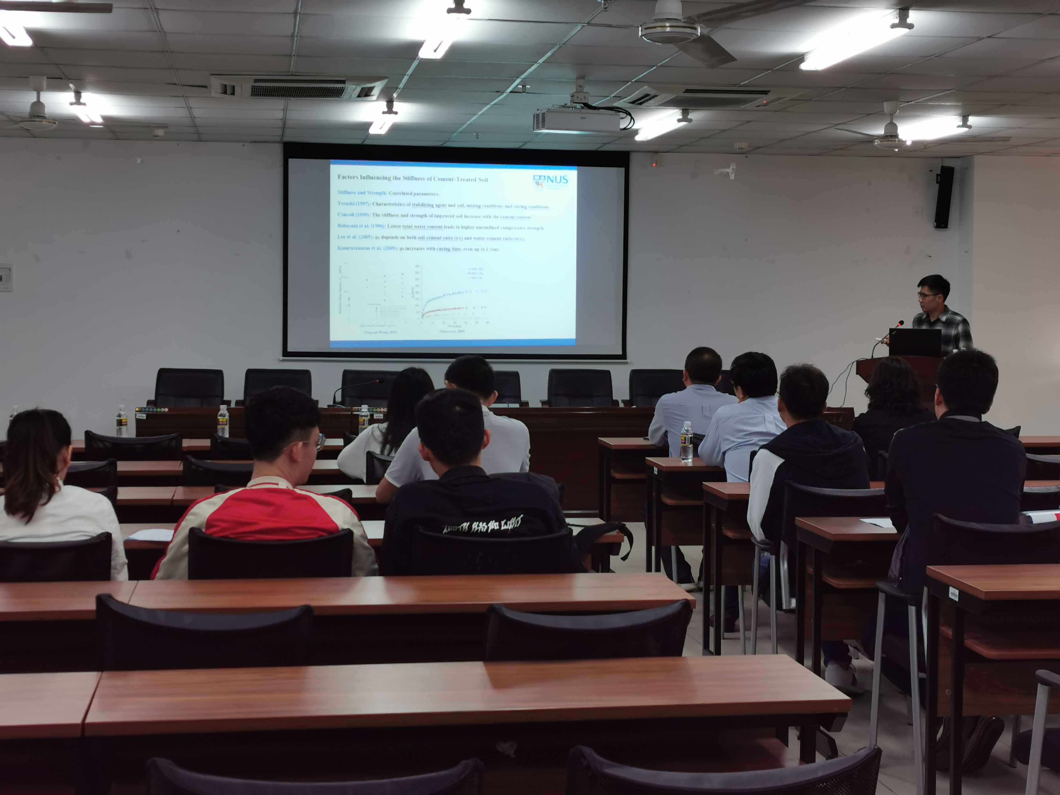 本次报告主要介绍了水泥加固土小应变的研究进展。姚凯博士结合水泥加固新加坡海相软土的特殊性质,详细介绍了对于小应变测试手段(弯曲元,共振柱,局部应变传感器)的改进细节,并运用改进后的研究手段,针对加固后土体进行了一系列参数研究(配合比,围压等)。到会的企业相关负责人、学院师生与姚凯博士充分交流,达成了产学研合作意向。同时,此次报告开阔了师生们的研究视野,也对相关课题的研究提供了新思路。