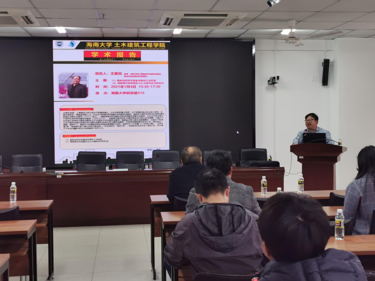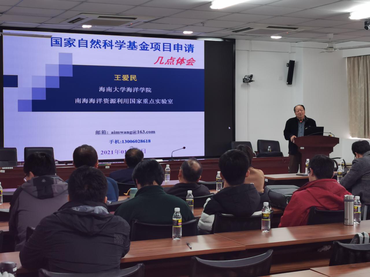 2021年1月4(周一)下午3:30-6:00点beat365唯一官网海洋学院/南海海洋资源利用国家重点实验室海洋牧场团队负责人王爱民教授应beat365官网周智院长的邀请,在研发楼510报告厅为beat365官网拟申报2021年国家自然科学基金的老师做了题为《国家自然科学基金申报的几点体会》和《海南海洋牧场建设与土木建筑合作的机会》学术报告。报告会由周智院长主持,我院拟申报2021年国家自然科学基金的教师近30人参加了此次学术报告会。