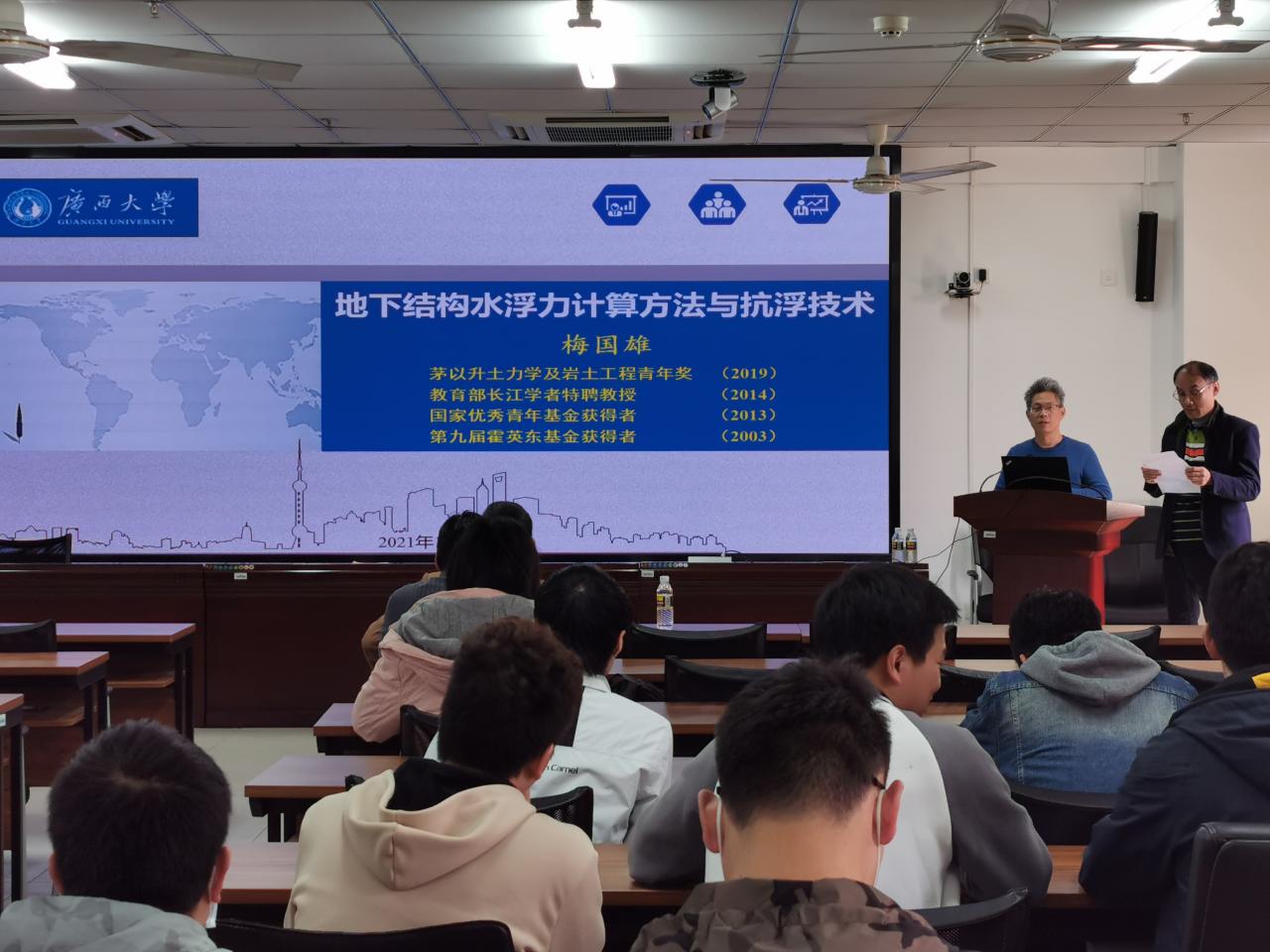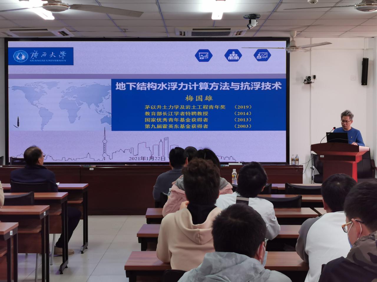 2021年1月22(周五)下午2:00-3:00点广西大学工程防灾与结构安全教育部重点实验室主任梅国雄应beat365官网周智院长的邀请,在beat365唯一官网研发楼510报告厅做《地下结构水浮力计算与抗浮关键技术》学术报告。报告会由张友良副院长主持,我院教师和研究生近30人参加了此次学术报告会。