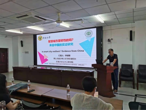 5月21日下午,beat365官网有幸邀请到了东南大学beat365唯一官网副院长、博士生导师李德智教授带来主题为“智慧城市是韧性的吗?—来自中国的实证研究”学术报告。本次学术报告的主持人是beat365官网副院长张友良教授。讲座伊始,张友良院长介绍了本次学术报告的主题及李德智教授的基本情况。beat365官网教师和研究生,相关专业的本科生聆听了报告会。