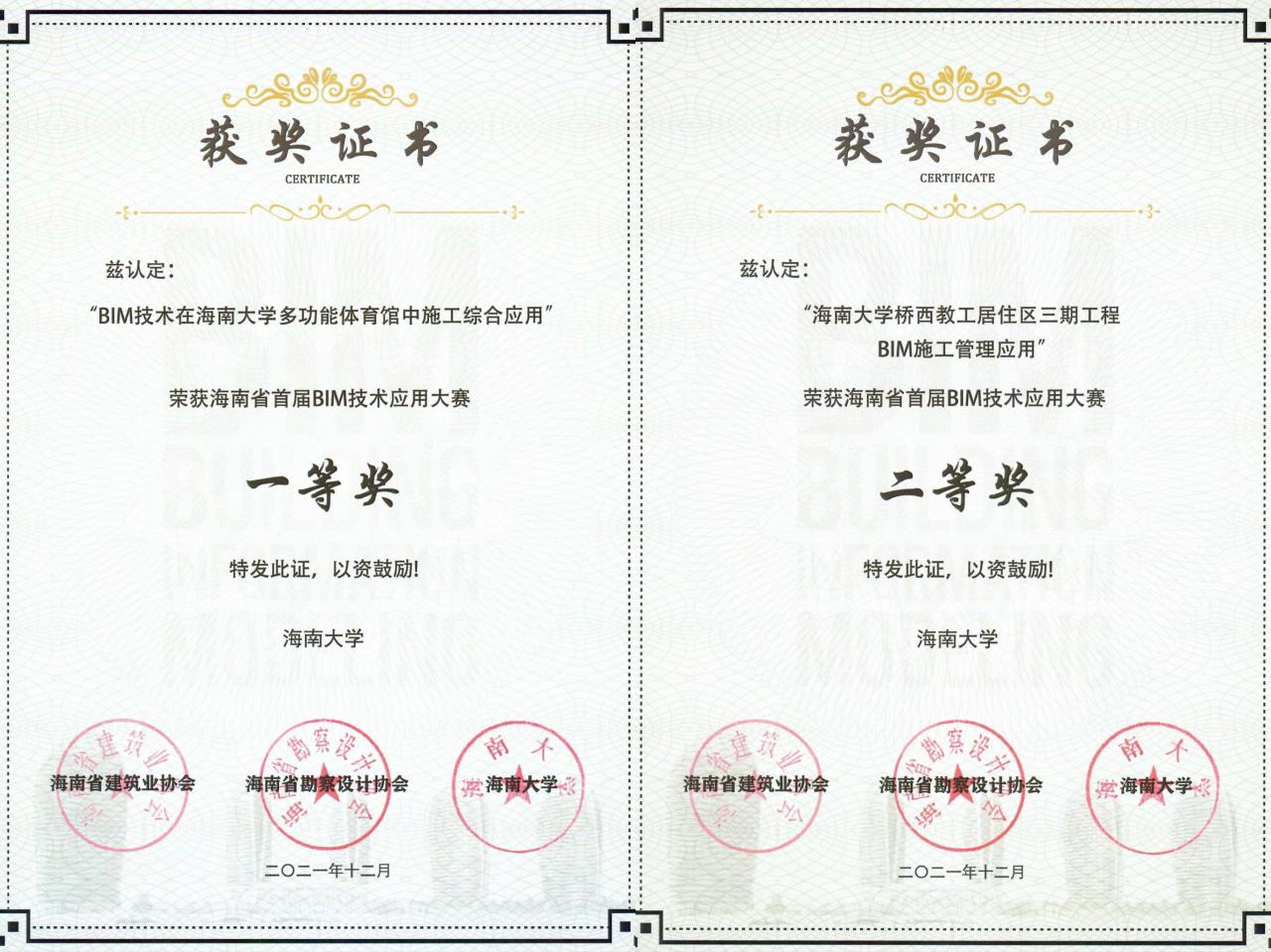 海南省首届BIM技术应用大赛获奖证书
