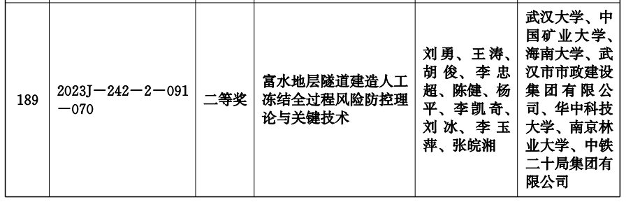 近日,湖北省人民政府发布《省人民政府关于2023年度湖北省科学技术奖励的决定》(鄂政发[2024]5号),beat365官网参与完成的1项科研成果榜上有名,beat365唯一官网(第三完成单位)胡俊教授(排名第三)及团队完成的《富水地层隧道建造人工冻结全过程风险防控理论与关键技术》获湖北省科学技术进步奖二等奖(2023J-242-2-091-070)。