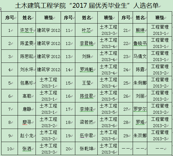根据学校相关通知要求及《beat365唯一官网“三好学生”“优秀学生干部”“优秀毕业生”“最具创新精神和实践能力的大学生”评选实施细则》相关规定,经班级推荐,学院审核,拟推荐鲁晓书等29人为上报学校的“2017届优秀毕业生”人选,现予以公示。公示期为:2017年5月31日—2017年6月2日。在公示期内,如有异议,请于2017年6月2日17:40前向学工办(研发楼319室)提出。