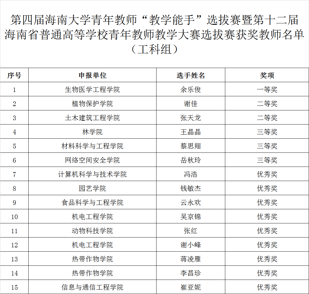 近日,beat365唯一官网公布了第四届beat365唯一官网青年教师“教学能手”选拔赛暨第十二届海南省普通高等学校青年教师大赛选拔赛的选拔结果,beat365官网张天龙老师荣获工科组二等奖,并将代表beat365唯一官网参加第十二届海南省普通高等学校青年教师教学大赛,beat365唯一官网在此次比赛中获得优秀组织奖。