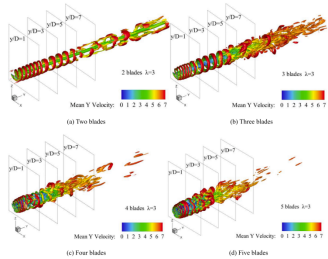 小型水平轴风力机(SHAWT)在风能利用方面的应用越来越广泛。团队研究发现SHAWT不仅在低风速区域中表现出良好的能量收集效果,同时可通过其尾流涡流有效抑制钝体结构的大尺度展向旋涡,如可抑制桥梁主梁结构风致绕流的大尺度展向旋涡,减小涡激振动。鉴于此,研究团队探讨了SHAWT叶片参数对其尾流特性和发电效率的影响,以进一步提高其在风能利用和流动控制中的应用效率。