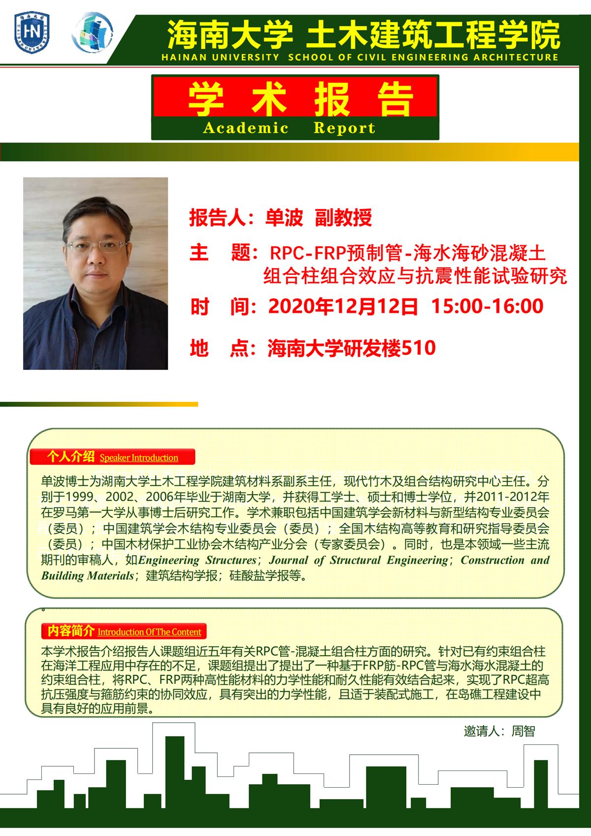 12月12日下午3点,研发楼510举行术报告会,主题《RPC-FRP预制管-海水海砂混凝土组合柱组合效应与抗震性能试验研究》,欢迎学院各位老师参加。报告人:湖南大学单波副教授。