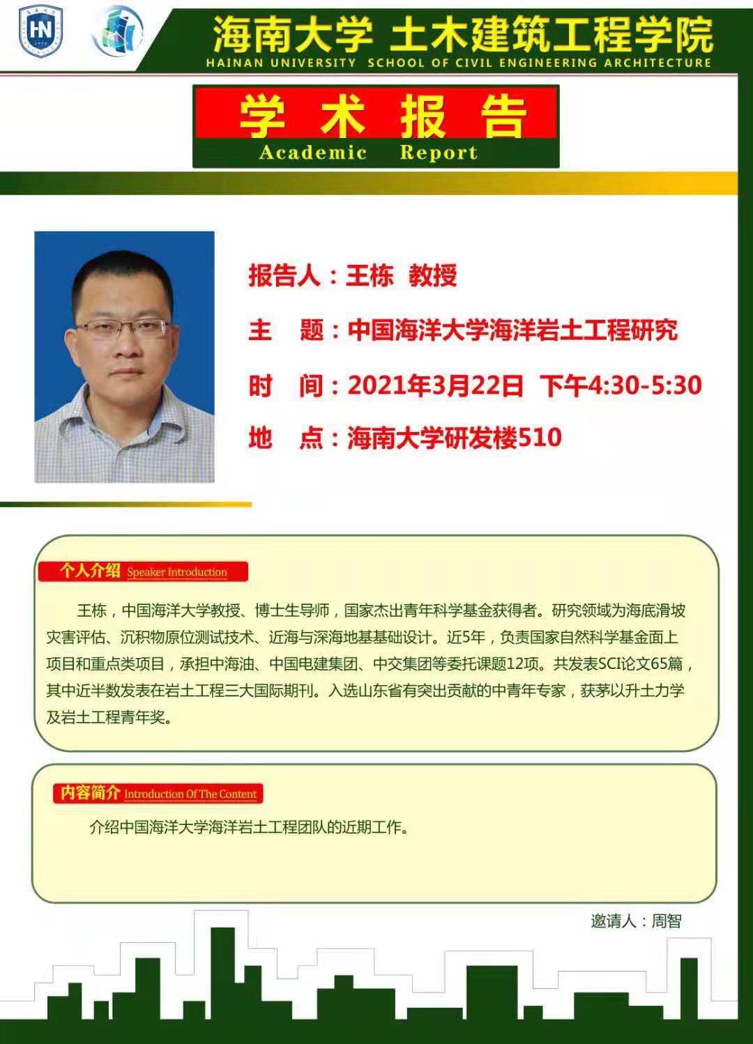 3月22日(周一)下午4:00-5:30点在beat365唯一官网研发楼510,中国科学院武汉岩土力学研究所,博士生导师汪稔研究员和中国海洋大学王栋教授分别在beat365官网做题为《岛礁建设对“一带一路”倡议的贡献》和《中国海洋大学海洋岩土工程研究》。请有兴趣的老师和没有课的研究生务必参加,到时会做参会签名,考勤记录。特此通知 学科与科研办 2021年 3月21日
