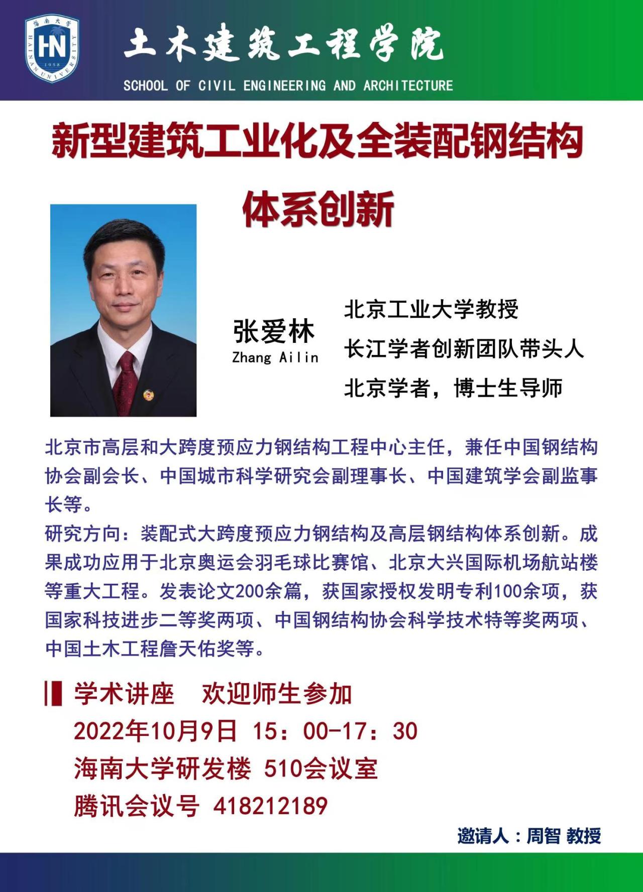 10月9日(周日)下15:00-17:30 点在beat365唯一官网研发楼510,北京工业大学张爱林 教授在beat365官网做《新型建筑工业化及全装配钢结构体系创新》学术报告。请有兴趣的老师和研究生通过线上同步方式参加。
