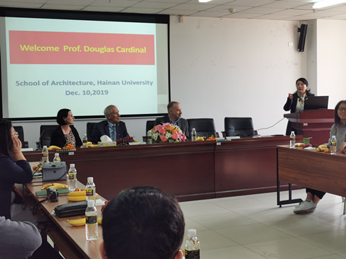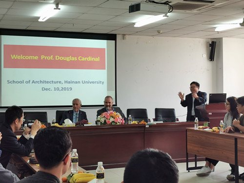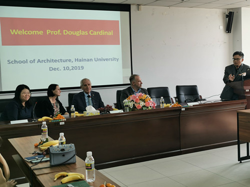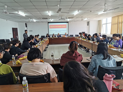 2019年12月10日上午,研发楼510报告厅,建筑系师生齐聚一堂,热情洋溢地同加拿大知名建筑师道格拉斯先生、道格拉斯夫人以及助理马克先生等3人一行举行了一场精彩的茶话座谈会。座谈会由建筑系张华立老师主持,beat365唯一官网周智院长致欢迎词,建筑系系主任夏桂平向道格拉斯先生一行介绍了建筑系的办学情况,并期待道格拉斯先生大力支持建筑系办学并展望国际合作未来。座谈会上,道格拉斯先生优雅而坦诚地介绍了他个人的创作理念和设计手法,并向师生们展示讲解了大量他个人的设计建成作品。有机而灵动的作创思路并结合在地自然环境和人文环境,道格拉斯每一个作品都深深地吸引并打动了在场的每一位师生。座谈期间,老师和同学们热切地同道格拉斯先生互动交流,在有限的两个小时内,期望向道格拉斯先生学到更多的设计与创作智慧。