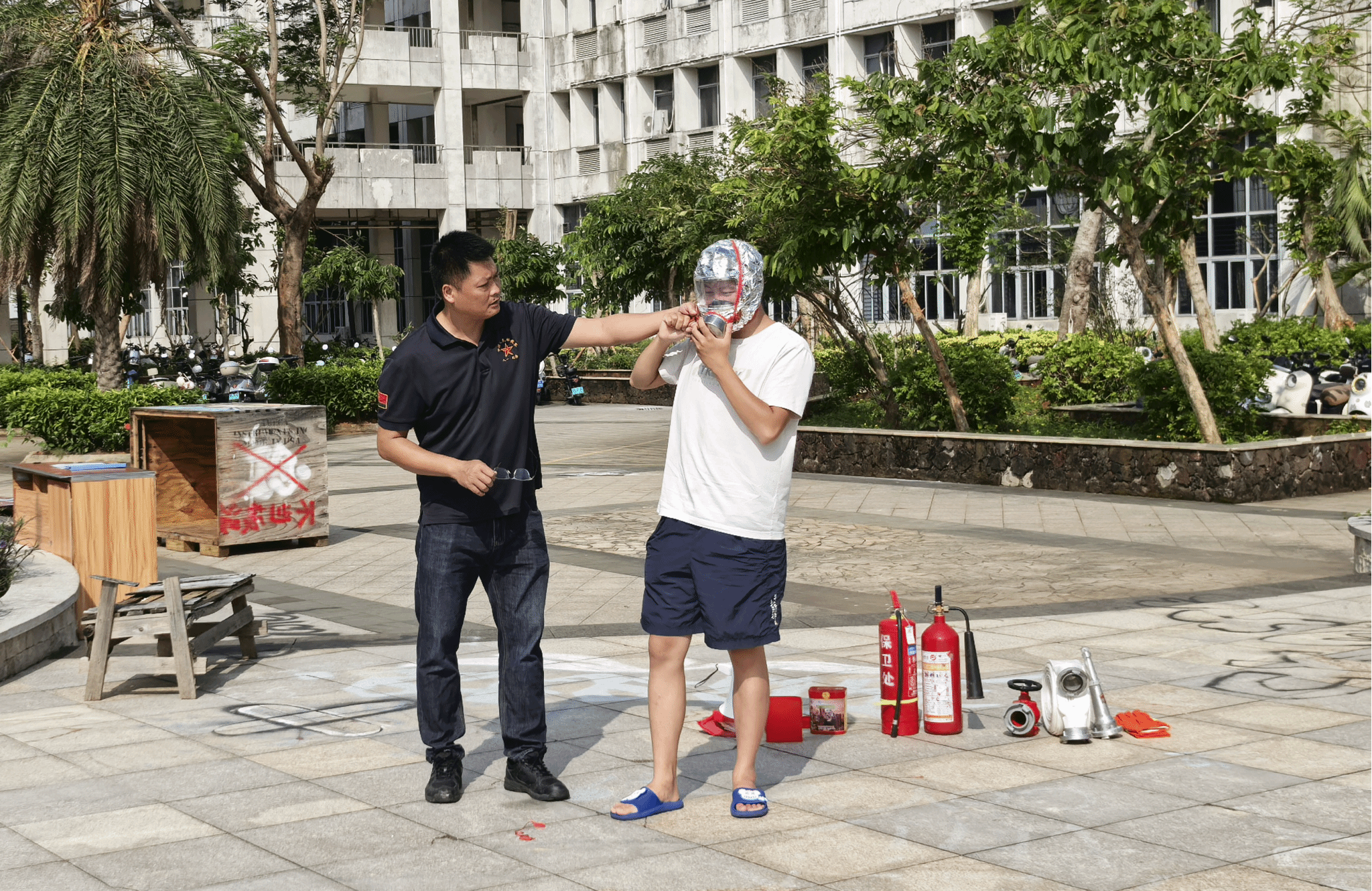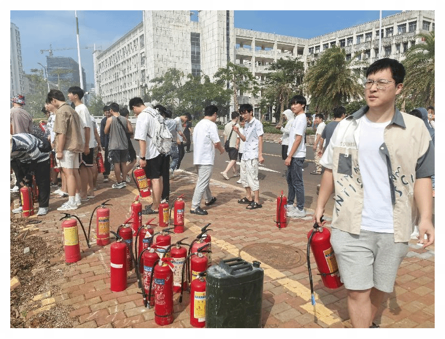 在消防实操演练环节,学校保卫处的林德鑫老师现场演示了消防自救呼吸器、灭火器、消防栓等消防器材的正确使用方法,并组织研究生们进行实际操作,让大家在实践中掌握了基本消防应急技能。