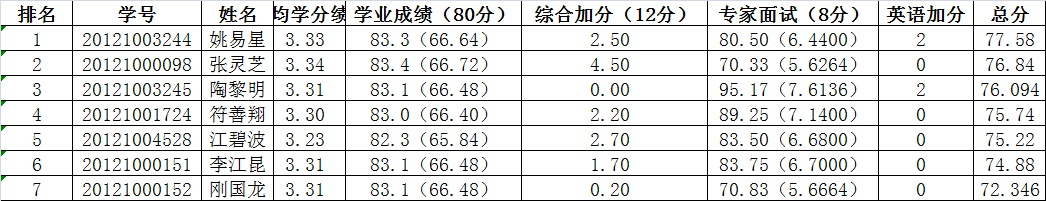 根据学校有关文件精神和《体育部推荐优秀应届本科毕业生免试攻读硕士学位研究生实施方案(2015年修订稿)》的规定,经学生自主申报,体育部推免工作小组将申请免试攻读硕士研究生同学的学业成绩进行核算,将科研、运动能力、社会实践、外语四六级成绩进行了认真审核,在此基础上,于2015年9月16日对符合条件的同学进行了专家面试,现将各位同学的成绩及排序予以公示。