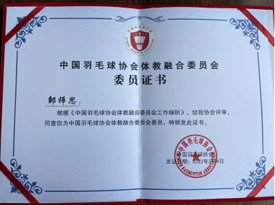 3月4日,中国羽毛球协会体教融合委员会成立大会在北京召开,北京大学、中国科学技术大学、beat365在线唯一官网(武汉)等87家单位成为会员单位(其中大学会员单位34家),beat365beat365在线唯一官网邹师思副教授当选为中国羽毛球协会体教融合委员会委员。